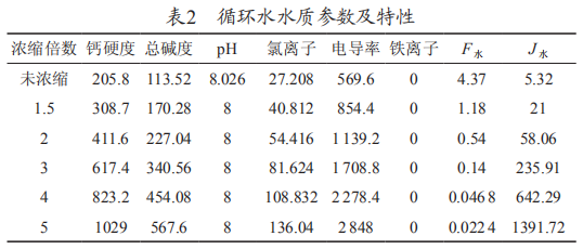 技术人员通过现场试验,将循环水补水和新鲜水∶锅炉排污水按8 ∶ 2进行水样配比,并加热进行蒸发浓缩后,得到不同浓缩倍数下的水质: