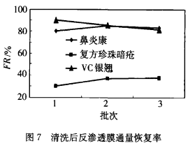 其中,进行鼻炎康提取液和VC银翘提取液浓缩试验的膜芯通量,经反渗透专用清洗剂较易恢复膜通量,如图7。复方珍珠暗疮提取液中用到的中药材比较复杂,体现在试验过程中,膜芯污染程度较深,试验完成后单独用反渗透专用清洗剂效果并不明显,通量恢复率仅达到30%以上。实际工程操作中,选用一定浓度的乙醇循环浸泡半个小时后,再用反渗透专用清洗剂后膜芯水通量得到良好恢复。