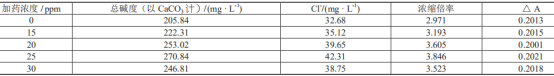 向补水中添加不同浓度值的无磷阻垢缓蚀剂,放进水浴锅中,调节溫度在(50±1)℃,同时利用旋转挂片仪的旋转搅拌和通气功能,对循环水进行搅拌和通空气。试验过程中在加热鼓气的条件下,使试液蒸发浓缩,测定不同浓度值下试液中的碱度及氯离子成分,结果见下: