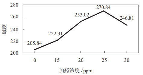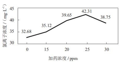 可以看出,伴随着加药浓度值的升高,碱度及氯离子成分不断升高,浓缩倍率相应增大,药剂浓度值为25mg/L时达到上限,之后继续提升药剂浓度值,碱度及氯离子数据则降低,依据此数据绘出对比曲线: