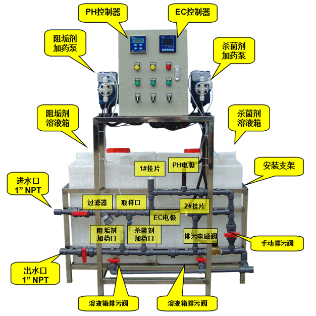 循环冷却水采取加缓蚀阻垢剂和杀菌剂的联合三亿首页方式,一套缓蚀阻垢剂加药装置和一套杀菌剂加药装置,水质化学药剂的种类及加药量将根据动态试验结果确定,杀菌剂采用间断投加方式。