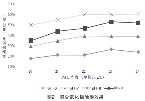 聚合氯化铝配制为1g/L溶液,取水样300mL若干置于烧杯中,将水样pH值调整为6、7、8、9,选用聚合氯化铝作为混凝药剂,聚合氯化铝投加量分别为20mg/L、21mg/L、22mg/L、23mg/L、24mg/L。搅拌混合均匀,静置10min,取上清液测定总磷浓度。