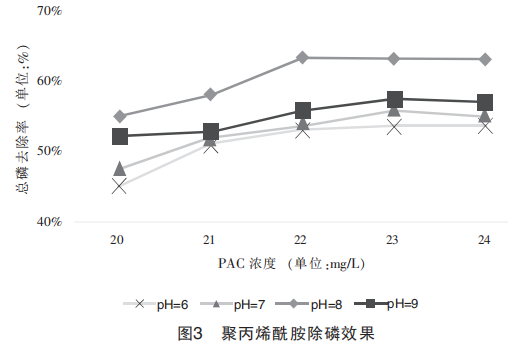 聚丙烯酰胺配制为1g/L溶液,取水样300mL若干置于烧杯中,将水样pH值调整为6、7、8、9,选用聚丙烯酰胺作为混凝药剂,聚丙烯酰胺投加量分别为20mg/L、21mg/L、22mg/L、23mg/L、24mg/L。搅拌混合均匀,静置10min,取上清液测定总磷浓度。
