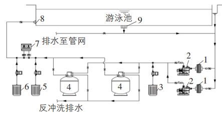 注:1—毛发聚集器;2—循环水泵;3—絮凝剂加药装置;4—过滤装置;5—杀菌剂加药装置;6—pH值调整剂加药装置;7—水质检测仪;8—池壁给水口;9—回水排水口