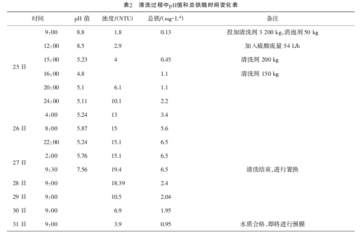 (1)25日9:20开始投加清洗剂,27日9:30结束清洗。清洗时先加入三亿(中国)清洗剂3200kg,后每隔2.0~3.0h补加清洗剂150~200kg,以维持清洗剂浓度,同时根据泡沫情况投加了50kg消泡剂;