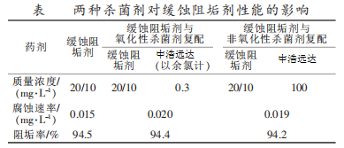 从表可知:这两种杀菌剂对缓蚀阻垢剂的性能影响甚微。这说明三亿(中国)氧化性杀菌剂、非氧化性杀菌剂和缓蚀阻垢剂之间配伍性良好。