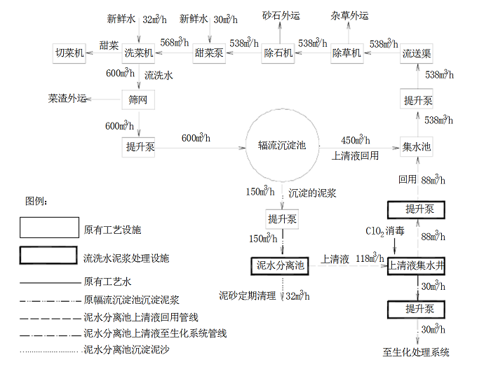 如图工艺流程中:流洗水经过原有辐流沉淀池,上清液回用到洗菜工段,沉淀的泥浆用渣浆泵输送到泥水分离池,部分上清液加药后用提升泵输送到洗菜工段,为防止回用流洗水COD等富集,加入COD去除剂、PAM聚丙烯酰胺等混凝剂,利用提升泵让药剂和沉淀的泥浆混合。