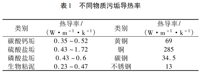 (2)污垢影响导热率,会影响凝汽器换热效率。表1为不同物质导热率比较结果,由表1可看出,黄铜热导率约是碳酸钙垢的132倍~197倍,约是生物粘泥的146倍~300倍。