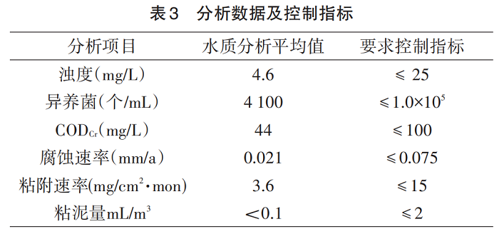 凉水塔塔壁较为干净,没有藻类生长。循环水系统水质各项指标控制非常好,腐蚀速率和粘附速率远远低于控制指标,有效地控制了系统中微生物、藻类的繁殖,收到了较好的效果。具体分析数据见表3: