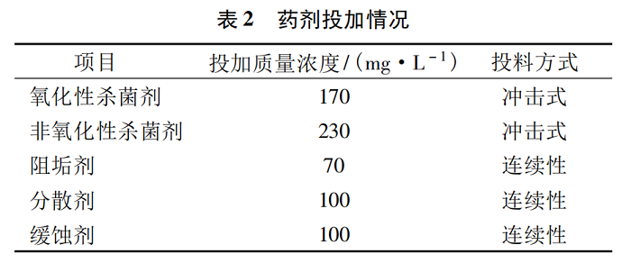 加大阻垢剂、杀菌剂等药品浓度以控制系统的污垢沉积、金属腐蚀。通过投加阻垢剂、分散剂减少污染物质的沉积;投加缓蚀剂可对循环水的腐蚀作用进行有效控制。药剂投加情况如表2所示: