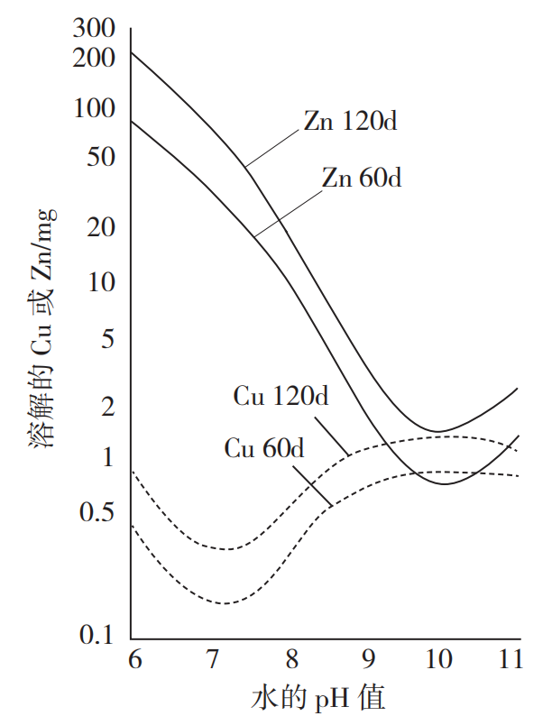 在pH<9的水中,黄铜中锌的腐蚀速度比铜大得多,因而会发生脱锌腐蚀,pH值对黄铜脱锌腐蚀的影响如图所示: