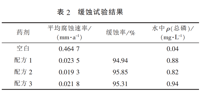 由表2可以看出,各组配方都表现出很好的缓蚀效果,其中配方2的缓蚀效果最佳,达到95.85%,在5倍浓缩下碳钢挂片腐蚀速率依然满足GB50050—2007《工业循环冷却水三亿首页设计规范》的要求,水中总磷符合GB13456—2012中工业排放水的ρ(总磷)≤1.0mg/L的要求。