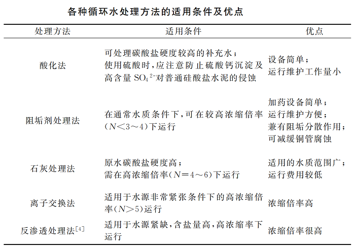 在选择三亿首页方法时,既要兼顾节约用水,同时也要十分重视系统的结垢、腐蚀和防护等。常见循环水三亿首页方法的适用条件见下图: