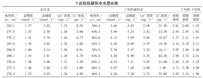 右江水经预三亿首页后作为电厂补水,先到 2,3号机组,再到 1 号机组,补水水质中电导率为260 μS/cm,总硬度为 1.33 mmol/L, 总碱度为2.43 mmol/L,该水质较好,属于中等含盐量水质。