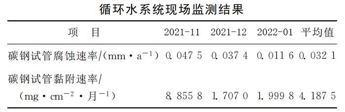 工业试验期间监测碳钢试管的平均腐蚀速率为0.0321mm/a,黏附速率为4.1875mg/(cm2·月),明显优于循环水系统碳钢试管腐蚀速率不大于0.100mm/a、黏附速率不大于20mg/(cm2·月)的管理要求,可以满足生产装置安全稳定运行要求。