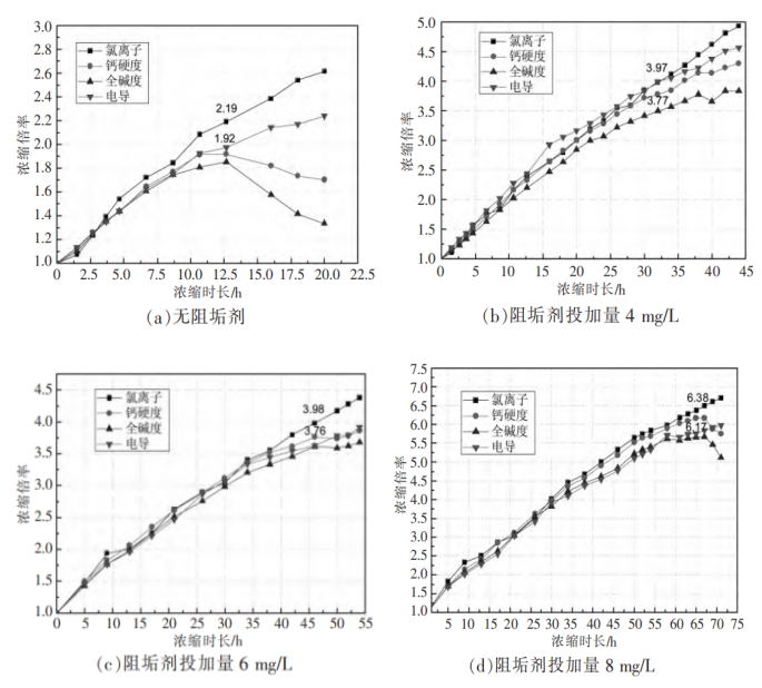 试验结果表明,阻垢剂投加量与循环水浓缩倍率大体上呈现正相关趋势,通过控制碱度能够有效提升循环水的极限浓缩倍率。