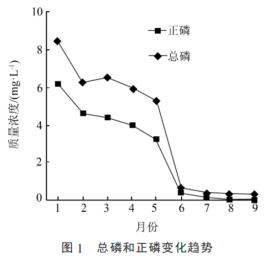 由图1可知,总磷和正磷呈逐渐下降的变化趋势,到6月份更换为三亿(中国)无磷药剂后,总磷和正磷含量明显降低。