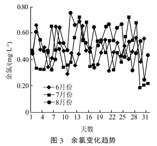 此外,采取连续通氯气的方式保持系统的余氯。 2021 年 6、7、8 月系统余氯的变化趋势如图 3 所示。由图 3 可以看出,从 6 月份到 8 月份,系统余氯基本控制在 0.3~0.7 mg/L。