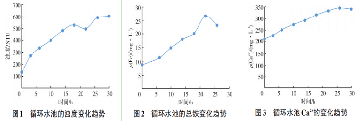 于9:30开启循环水池循环泵,此时水质较浑浊。循环一段时间后,10:00取样检测,pH为7.7、电导为1300.43μS/cm、浊度为130.3NTU、含铁8.98mg/L。