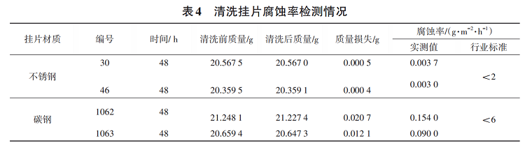 由表4可知:清洗过程中挂片腐蚀率远小于行业标准,而且小于一般常规的清洗预膜,表明本方案对设备基本无腐蚀,完全达到了预期。