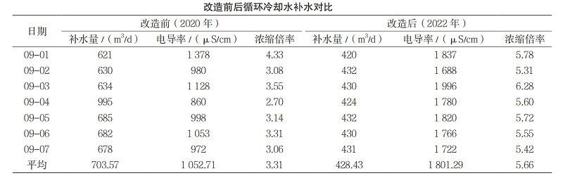 经比较分析,循环冷却水系统加药前后的补水量与水质变化如表所示。与改造前相比,改造后每天增加药剂费用 665 元,平均每天节约 275.14 m3水资源,节约水费 894.205 元。改造前,单台浓缩尾气凝结水回收器清理用时 6 d,且清理较困难;改造后用时2 d,清理容易。